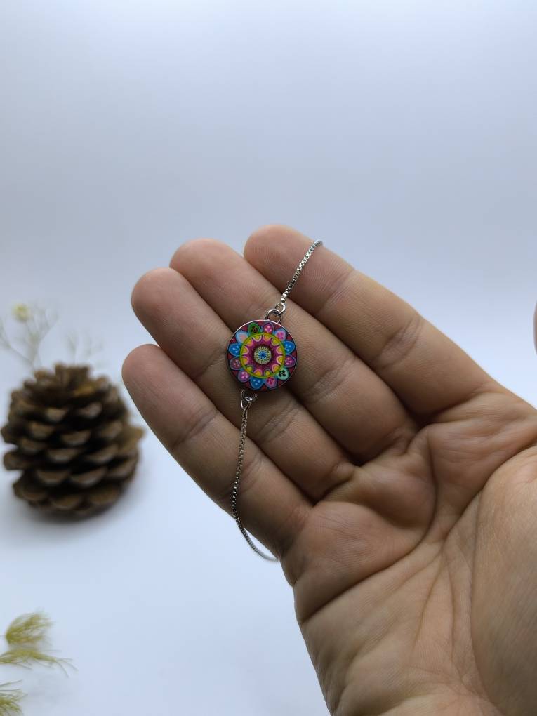 دستبند طرح ماندالا با شکل و شمایل بهار تداعی کننده رنگ های بهاری و ایجاد حس لطافت.
